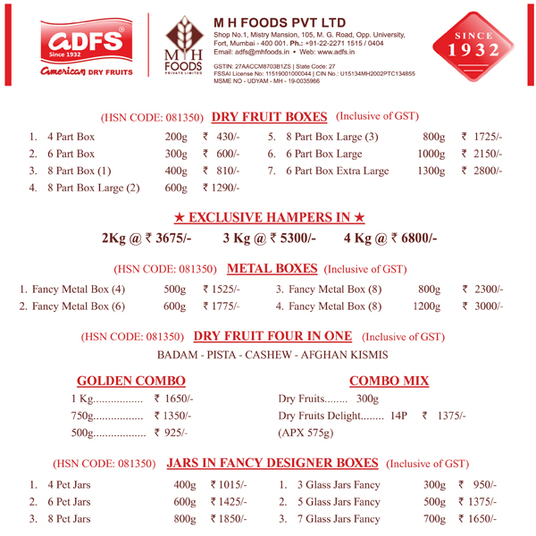 Please do bare with us till the new price list the entire range of products of best handpicked quality of Dry Fruits/Mithai’s that we can offer.
